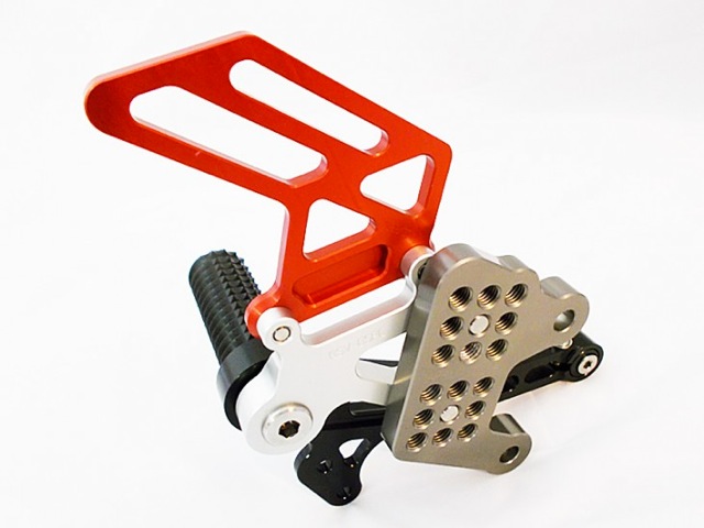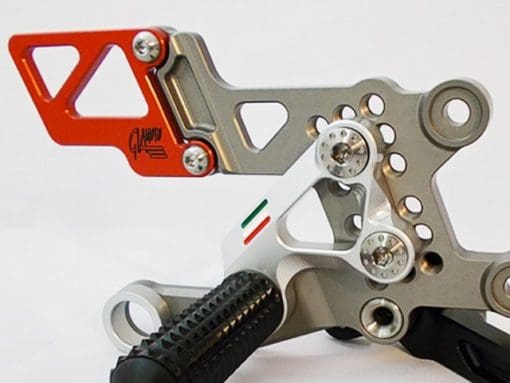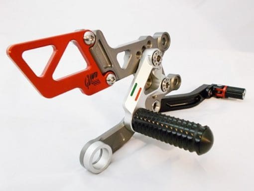 Made for fitting on the new RSV4 RF with pole position colour scheme of Red Black Titanium and silver, with spring returning folding gear and brake tip.